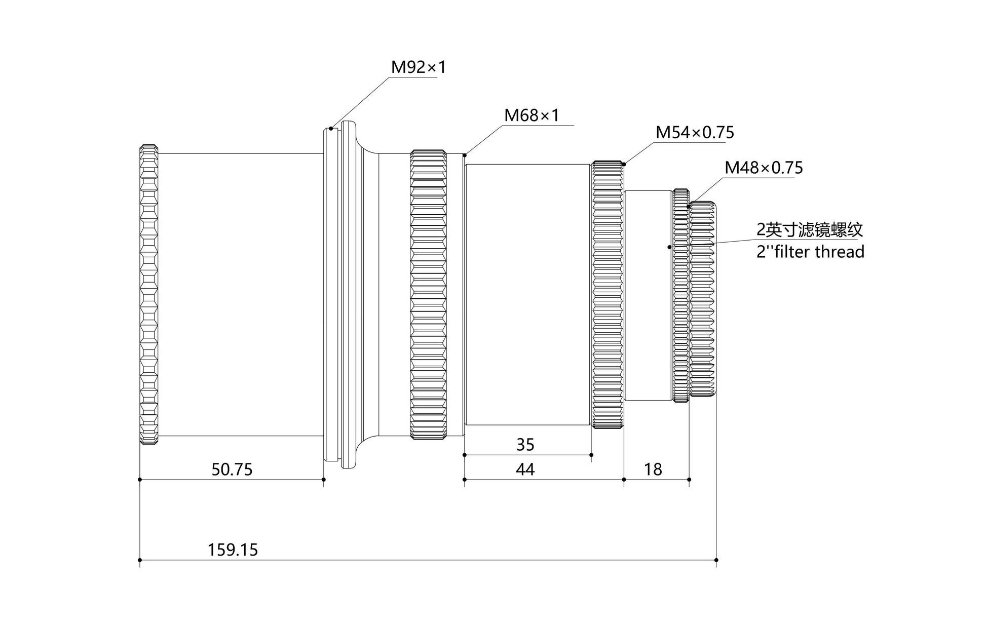 The 1.0x flattener sports triplet optics and supports a 44mm full-frame image circle. The overall weight is 0.79kg. The back focus from the M48 thread is a standard 55mm. The front thread is M92*1.