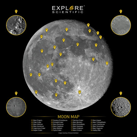 - The front side of the Explore Scientific Moon Features & Landing Map pinpoints the location of 24 features on the lunar surface that can be observed through a telescope.