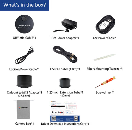 The QHY MiniCam8M Planetary Combo includes the MiniCAM8M and all its standard accessories, plus a LRGB filter set, a 20nm CH4 Methane filter, a 40nm UV filter, and a 10nm NA filter.