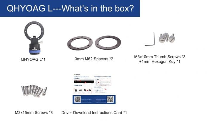 The QHY OAG-L, aka the M62 "large" version of the QHY Off-Axis-Guider, is designed to be thin yet solid at just 10mm thick with a weight of 149g. Adding an M62 threaded adapter ring adds only 3mm for a total thickness of 13mm. There are six 3mm through holes in the OAG for direct connection to the QHYCFW and QHY A Series cameras.