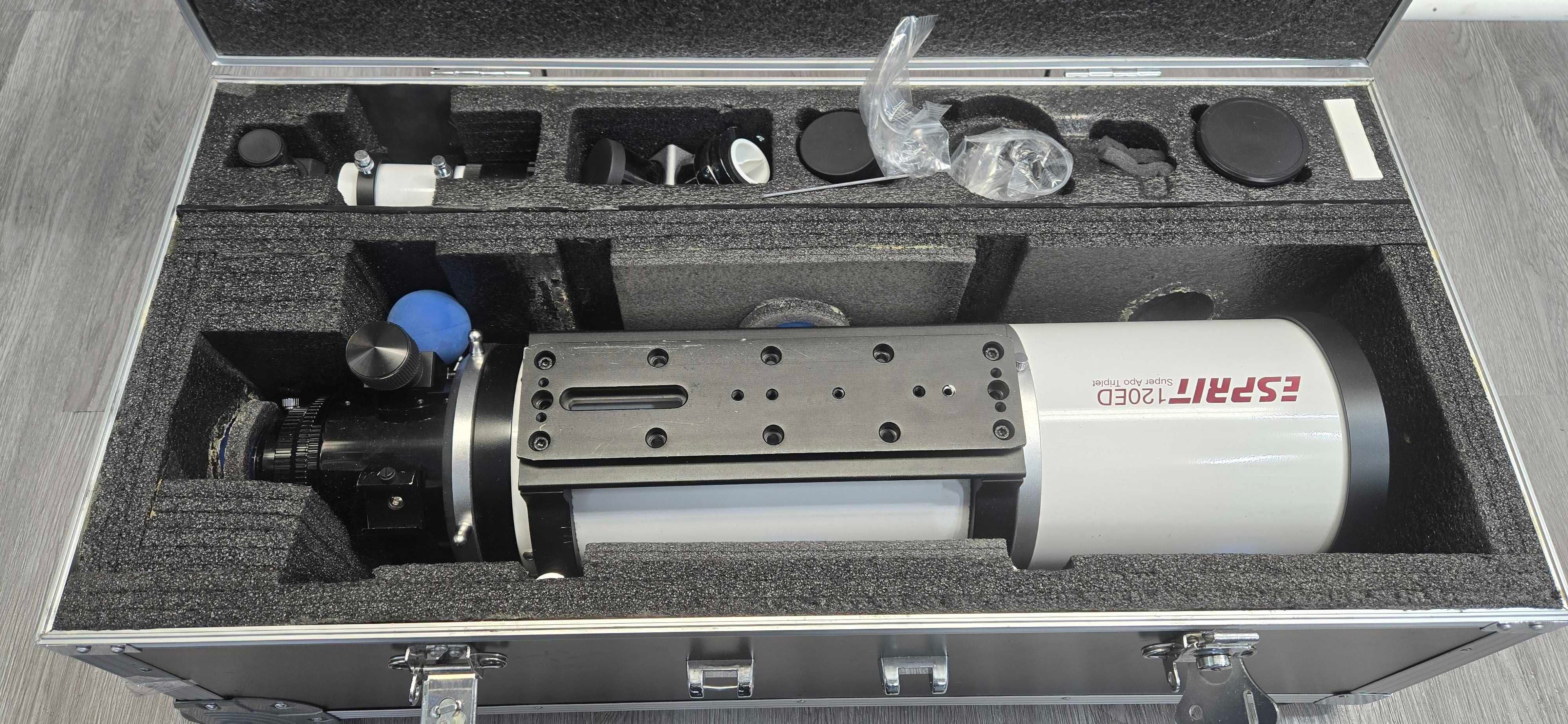 This 120 mm aperture Sky-Watcher Esprit 120 ED APO Refractor telescope was designed with the discerning astrophotographer in mind. Sky-Watcher USAâs top-of-the-line Esprit refractors deliver the kind of imaging performance one would expect from telescopes costing thousands of dollars more. This high-performance imaging telescope has a three-element air spaced objective lens design, and being apochromatic, false color is completely eliminated, yielding exceptional contrast and sharpness. The included 2-element field corrector lens guarantees a flat field across the entire imaging field.