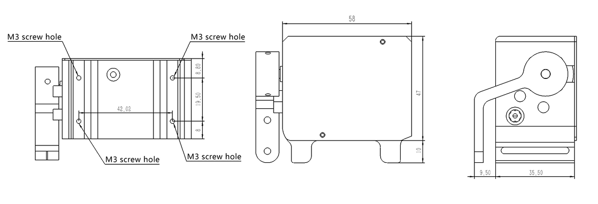 The electronics box is tough and sturdy, as are the metal arms and threaded connections. There are M3 threaded holes on the bottom of the box for convenient installation.