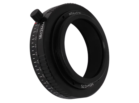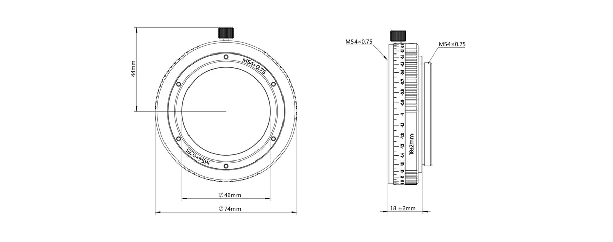 The M54 version of the Askar backfocus adjuster's front telescope interface is female thread M54x0.75 and the rear camera interface is male thread M54x0.75, the overall thickness is 18mm and offers ± 2mm adjustment range.