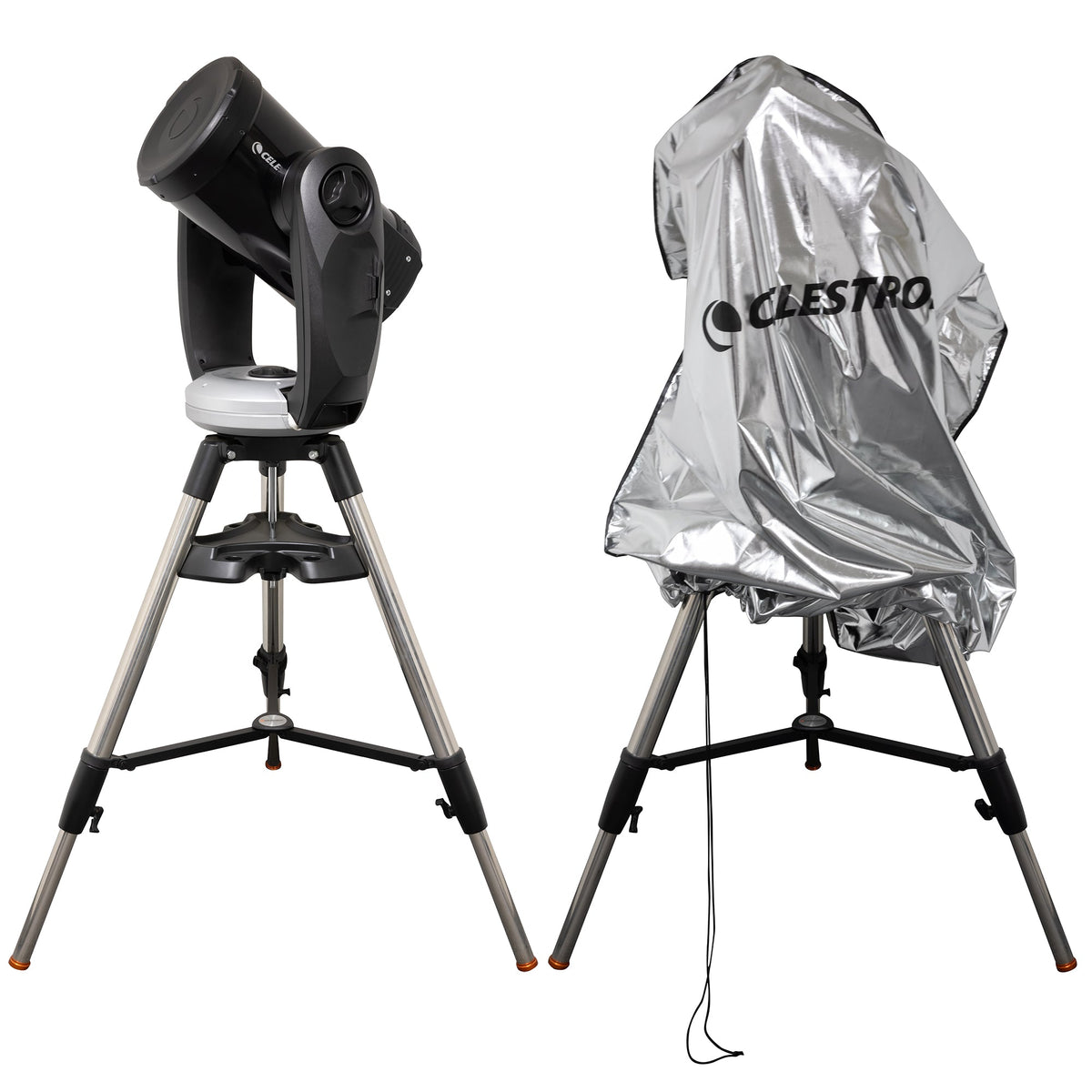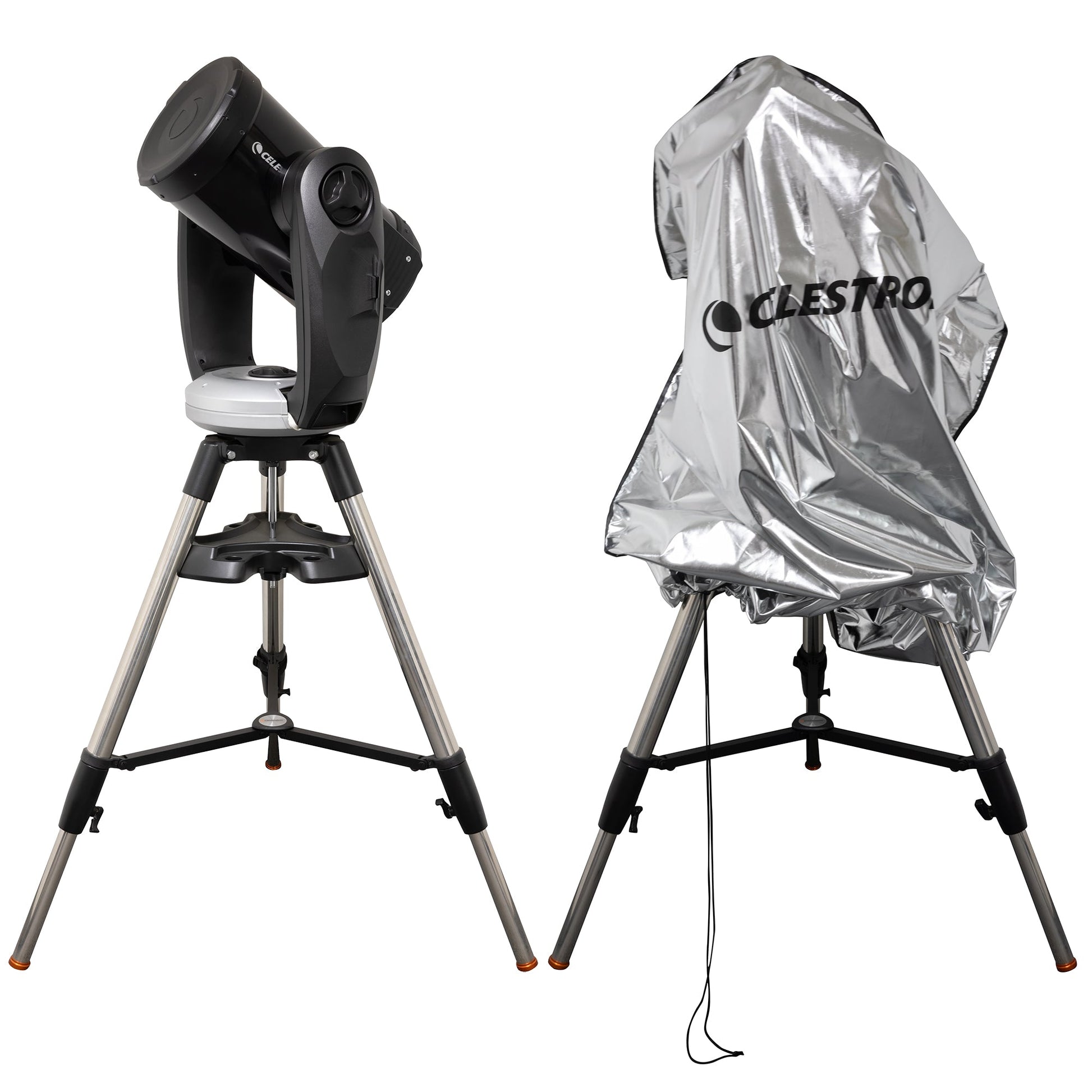 Measuring 1470 mm x 1795 mm, the cover fits most Celestron telescopes up to 11â apertureâtripod included. Below is a list of compatible models: