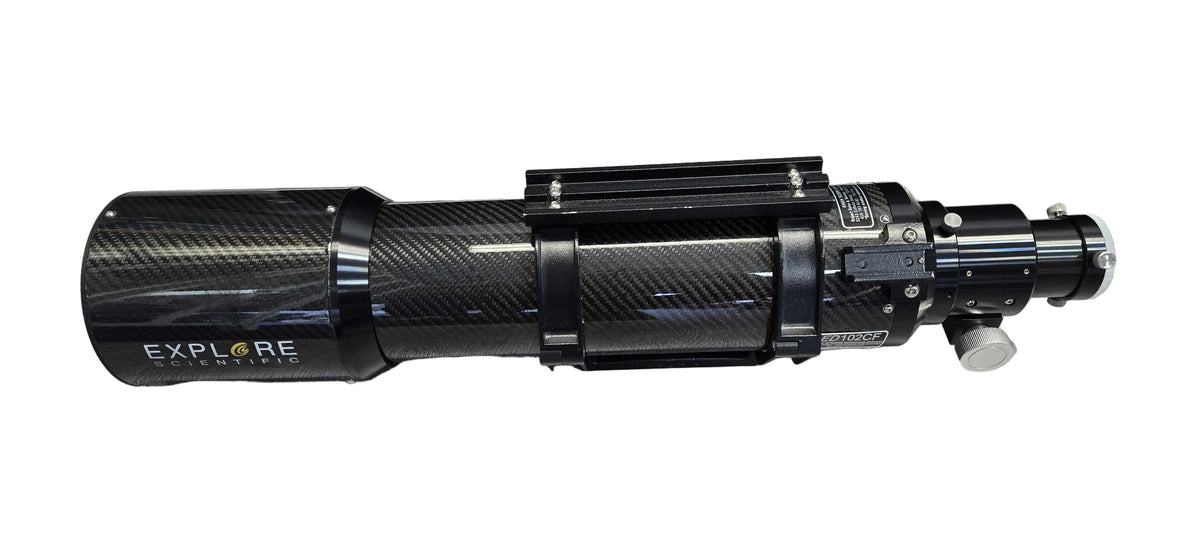 TheĀ ED102 102mm f/7 Carbon Fiber Refractor TelescopeĀ fromĀ Explore ScientificĀ is a versatile optical tube assembly that is powerful enough to clearly see the planets and bright deep sky objects. It has a relatively small form-factor that makes it perfect as a portable grab-and-go option, or set up on a dual-mount rig for astrophotography/astroimaging. Using Extra-low Dispersion (ED) glass in a triplet lens configuration, with fully multicoated optics, creates images that are clear and bright without distortion across the entire field of view, with true color rendition.