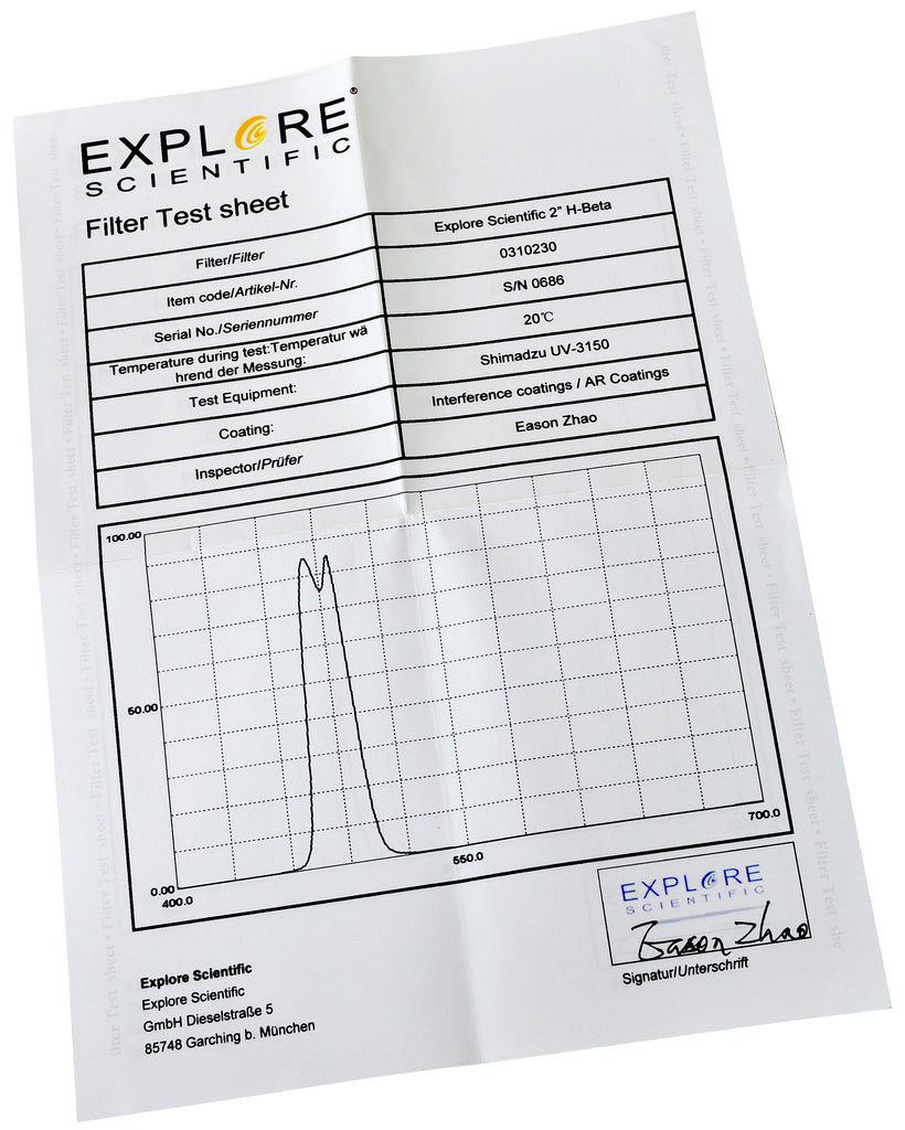 This is a stray light reduction filter which fits into your 2" eyepieces that have internal (female) filter threads. The Explore Scientific Narrowband H-Beta Filter 2" is designed for observing deep sky objects which glow in H-Beta light, and it is tuned specifically to pass the H-beta wavelength band of light. Hydrogen is the most abundant element in the Universe and many nebulae glow in the H-beta light. The H-Beta Narrowband Filter 2" from Explore Scientific does a good job of increasing contrast, providing a darker sky background. It does this by filtering out all the other wavelengths of light, while allowing the light from H-Beta nebulae or other sources to pass through so you can see them better. It has a total transmission specification of 94.5%.
