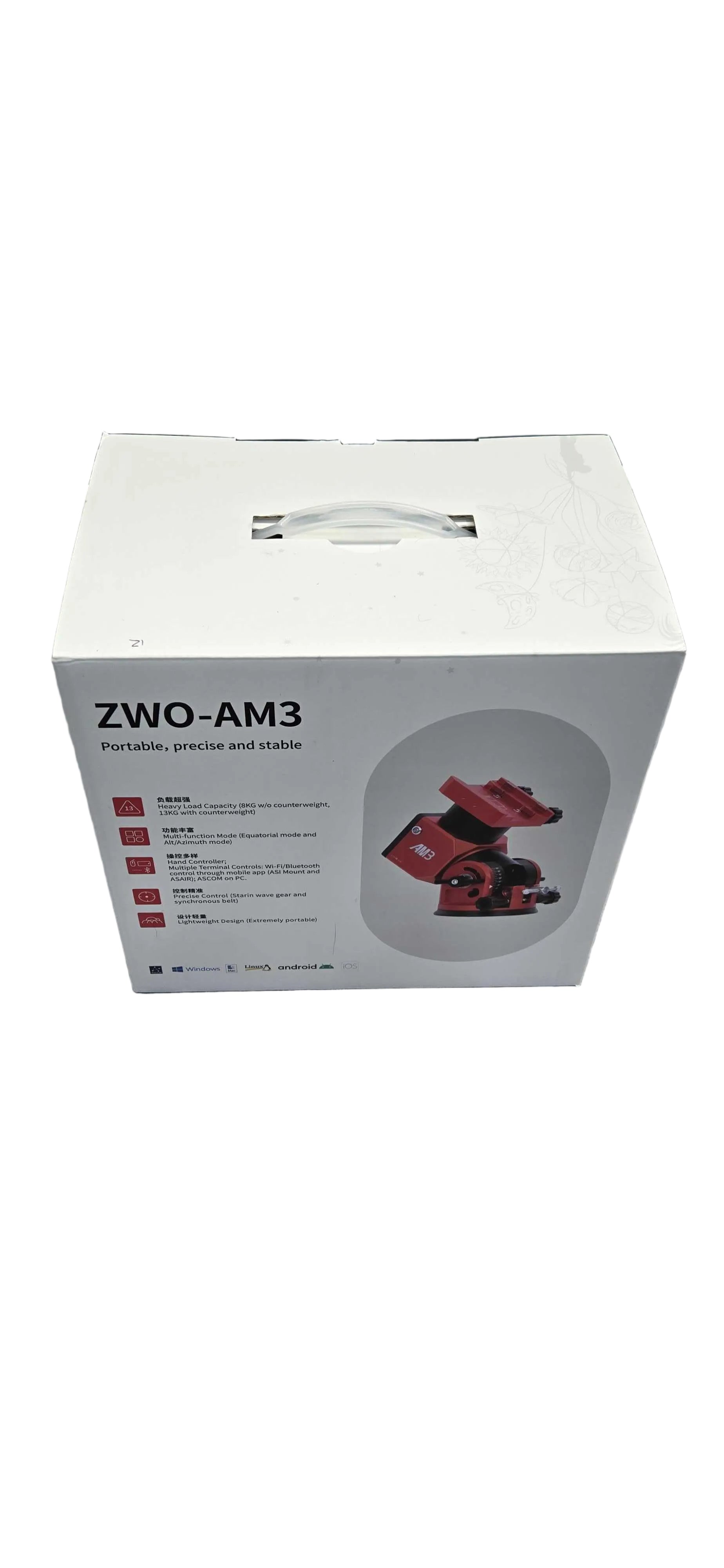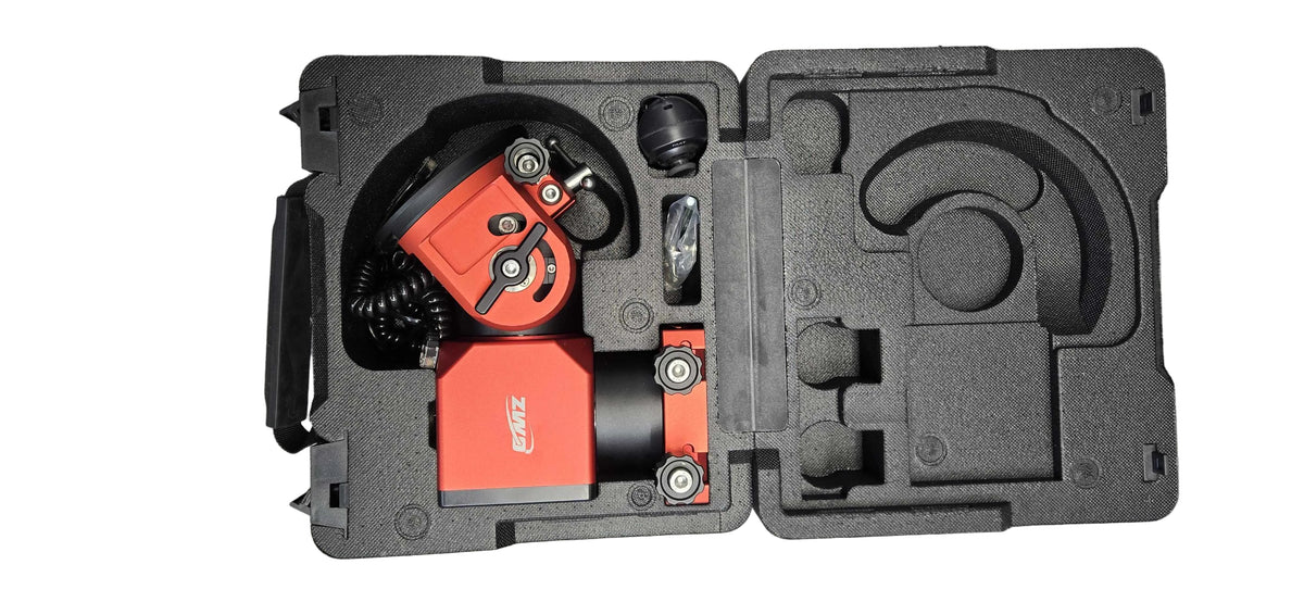 Want a telescope mount that is flexible and portable? Ā Weighing in at under 10 pounds, this lightweight yet strong harmonic AM3 equatorial mount from ZWO can handle a weight capacity of 17 +/- pounds, even without counterweights! Ā If you add the optional counterweights, the load capacity goes up to 13 kg, or about 28 pounds, which is really amazing for a mount with such a small form factor!!