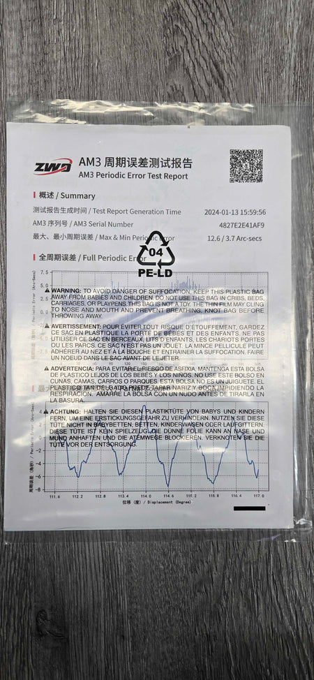 The strain wave gear has high torque and low periodic error that is controlled to within +/- 20 arc seconds. Each mount is tested and equipped with a PE curve before it leaves the factory!Ā The Strain Wave gear and synchronous belt used on the AM3 offers a reduction ratio of 300:1.Ā